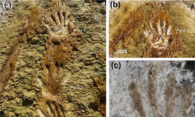 Lead author David Zhang of Guangzhou University said: ‘The placement of the prints is not as they would naturally occur, with tracks spaced by movement or hands placed to stabilise.